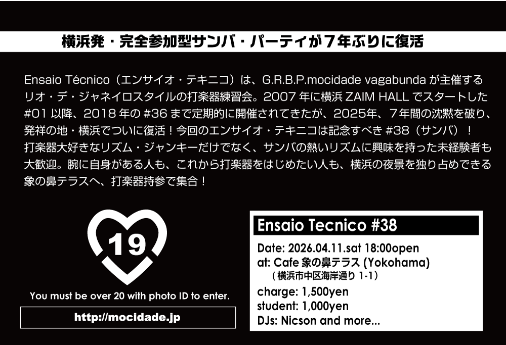 Ensaio Técnico (エンサイオ・テキニコ)は、G.R.B.P.mocidade vagabundaが主催するリオ・デ・ジャネイロスタイルの打楽器練習会。2007年に横浜ZAIM HALLでスタートした#01以降、2018年の#36まで定期的に開催されてきた本イベントは、2025年、7年間の沈黙を破り、発祥の地・横浜でついに復活!今回のエンサイオ・テキニコは記念すべき #38(サンバ)!打楽器大好きなリズム・ジャンキーだけでなく、サンバの熱いリズムに興味を持った未経験者も大歓迎。腕に自身がある人も、これから打楽器をはじめたい人も、横浜の夜景を独り占めできる象の鼻テラスへ、打楽器持参で集合!!!
